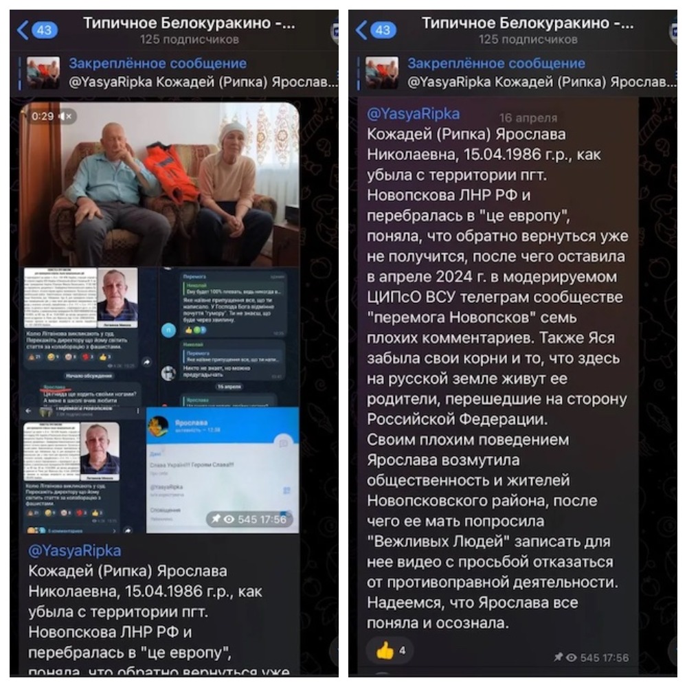 Тепер росіяни шантажують дівчину через відео з її батьками, на якому ті під тиском просять свою дочку не писати подібних коментарів.