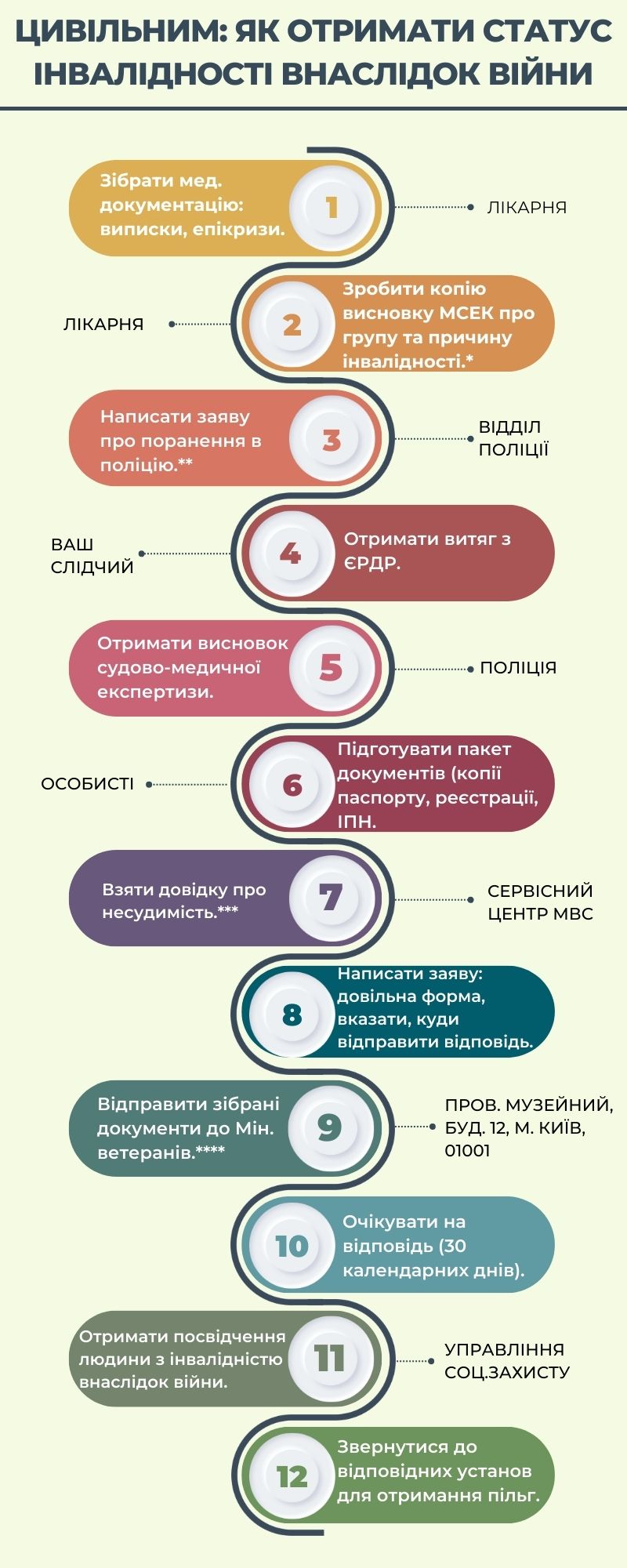 Людина збирає всю медичну документацію: епікризи, виписки тощо. Проходить МСЕК, де їй визначають ступінь втрати працездатності та групу інвалідності. З травня 2023 року МСЕК у довідці до акта огляду комісії вказує справжній характер шкоди здоров’ю. До того в графі «причина інвалідності» писали «загальне захворювання» навіть після поранення уламками боєприпасів чи кулями.