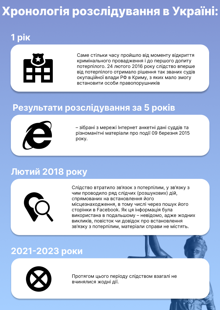 За строками це кримінальне провадження мало вже бути закрите, як були закриті провадження щодо інших епізодів затримання потерпілих в Криму. Це окрема вада в підході до розслідування таких злочинів за загальними правилами і процедурами – строки в них вкрай нетривалі. Злочин, передбачений ст. 340 КК України, кваліфікується як нетяжкий і тому його розслідування має бути завершене не пізніше ніж за 5 років. Інакше, відповідно до п. 3 ч. 1 ст. 49 КК України, особа звільняється від кримінальної відповідальності. Тобто це кримінальне провадження мало бути закрите ще в 2020 році, а в ньому досі не пред’явлено підозру жодній особі і слідство досі шукає свідків. Перебіг цих строків міг би бути зупинений, якщо потенційні винні ухилялися б від досудового розслідування. В такому випадку строки для притягнення до відповідальності сягали б вже 15 років. Але слідство не здійснювало жодних заходів, від яких винні особи могли би ухилятися.