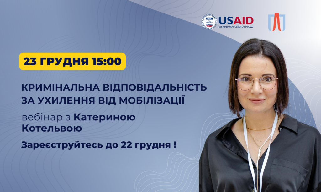 Українська Гельсінська спілка з прав людини запрошує на вебінар «Кримінальна відповідальність за ухилення від мобілізації: проблемні аспекти та сучасні реалії» з Катериною Котельвою. Вебінар буде корисним для адвокатів, юристів, суддів, представників організацій громадянського суспільства та інших осіб, зацікавлених у даній темі.