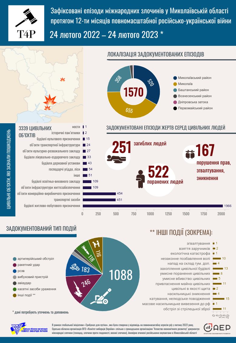 Було задокументовано та внесено до бази даних 1570 епізодів. Одеська обласна організація ВГО «Комітет виборців України» спільно з ГО «Агентство економічного розвитку» веде документування міжнародних злочинів (геноцид, злочини проти людяності, воєнні злочини), ймовірно вчинених російськими окупантами у Миколаївській області.