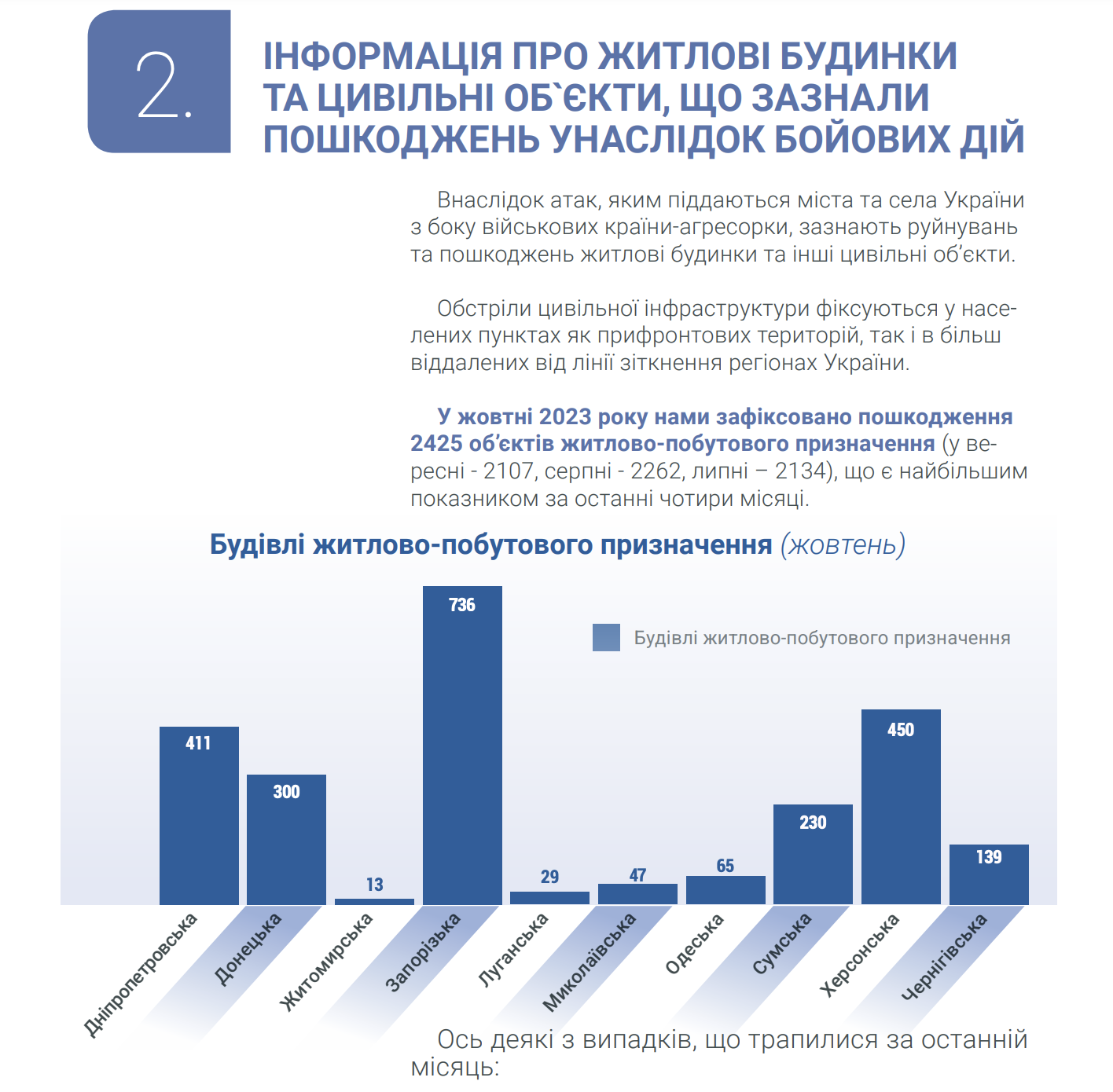 Детальну аналітику щодо жертв серед цивільного населення, руйнувань житлових будинків та цивільних об’єктів через збройну агресію РФ в Україні читайте у Огляді задокументованих воєнних злочинів Росії за жовтень 2023