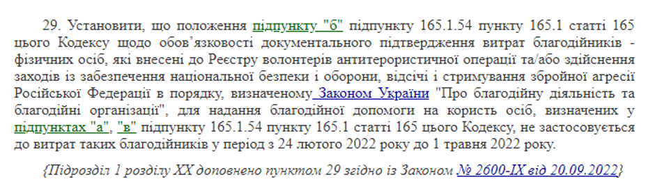 Винятком є необов’язковість документального підтвердження витрат волонтерів у період з 24.02.2022 року по 01 травня 2022 року, згідно п.29 підрозділу 1 розділу ХХ Податкового Кодексу України.