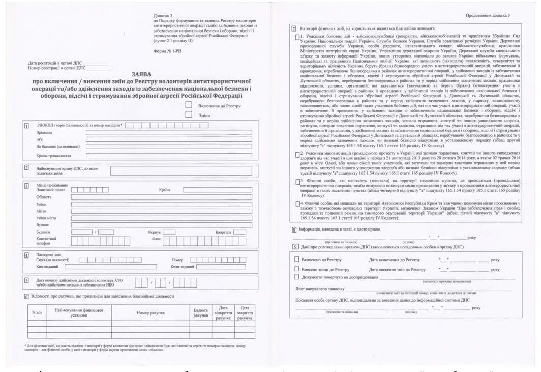 Заява форми № 1-РВ подається до будь-якого територіального відділу податкової служби України, незалежно від місця проживання чи місця знаходження фізичної особи. Разом з заявою до ДПС подається довідка з банку про номер рахунку, на який збираються кошти для ведення волонтерської діяльності, також копія паспорту і ідентифікаційного коду волонтера.