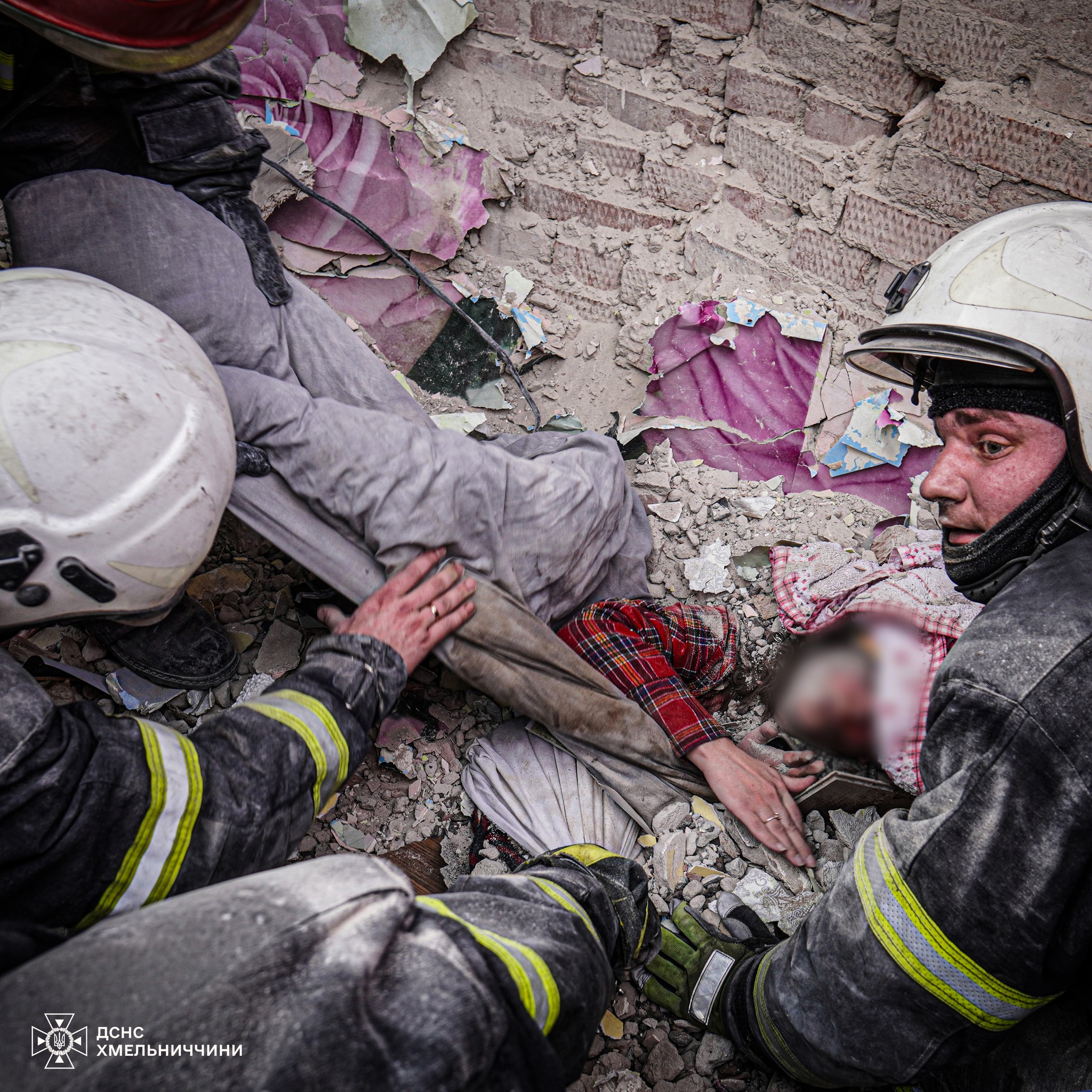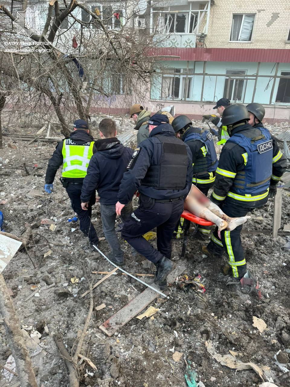 Основне фото: Патрульна поліція Хмельницької області. Розбір завалів внаслідок ракетного удару, м. Хмельницький,