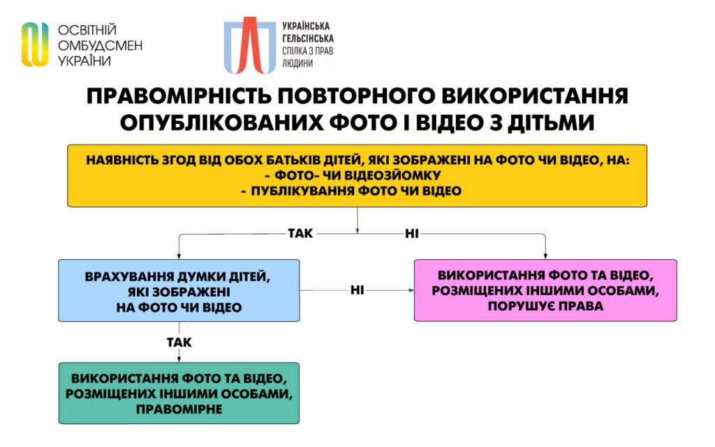 Особливої уваги потребує також дозвіл на використання вже створених матеріалів. Батьки та дитина мають бути поінформовані про те, де, з якою метою і в який спосіб будуть оприлюднені фото чи відео. І повинні мати право відмовитися.