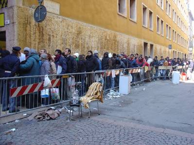 Щоб бути серед перших, і таким чином здобути шанс на входження у квоту, люди ще з обіду попереднього дня займали черги перед поштами, сиділи під дверима понад 24 години – видовище, яке не часто зустрінеш у інших європейських країнах. Звичайно, роботодавці-італійці не настільки відчували потребу у робочій силі, щоб провести безсонну ніч, тому перед поштою стояли лише іноземці, що теоретично повинні перебувати за межами країни. Були випадки, зокрема у Римі, коли до черг підходили карабінери. Тоді замість легалізації дехто отримував постанову про видворення з країни.
