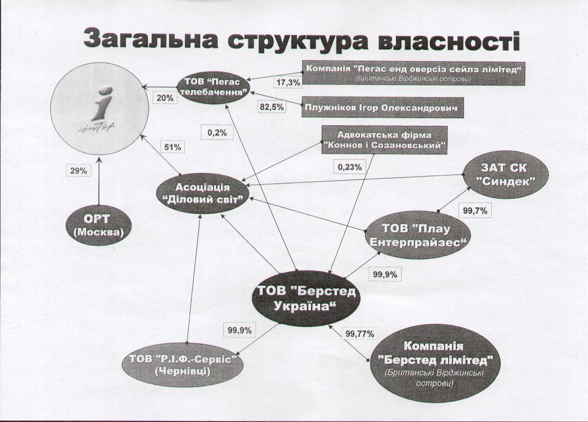 У свою чергу 82,5% ТОВ “Пегас Телебачення” володіє Ігор Плужніков (ред. – член СДПУ(о). Але, як повідомив Т.Шевченко, ця людина вмерла (ред. – у червні 2005 року), а про нового власника не відомо, оскільки дані про засновників були отримані Інститутом Медіа Права в грудні, а інформація в Головному міжрегіональному управлінні статистики в м. Києві була за станом на жовтень. Іншими 17,3% ТОВ “Пегас телебачення” володіє компанія “Пегас Энд Оверсиз Сейлз Лімітед”, заснована на Британських Віргінських островах, отже – в оффшорній зоні.