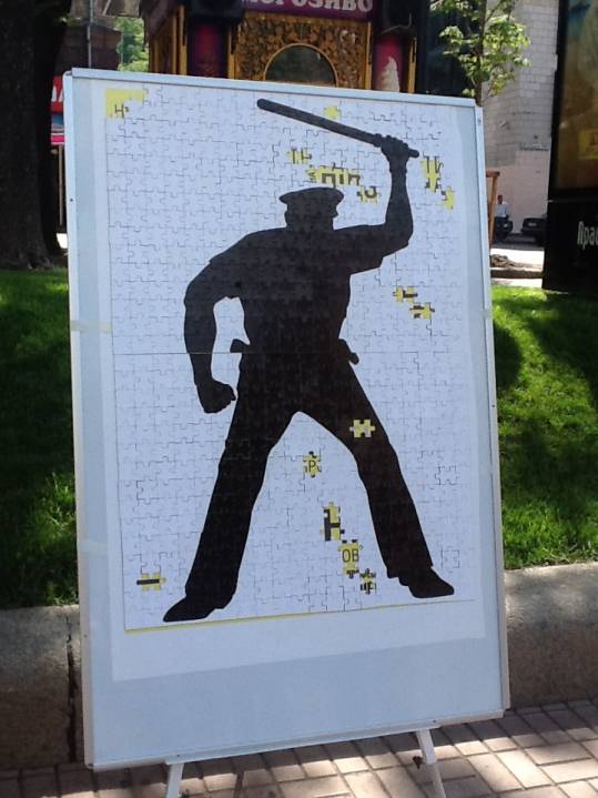 У центрі міста, біля станції метро «Хрещатик», було встановлено магнітний пазл із силуетом міліціонера, що замахується кийком. Кожен бажаючий підписати петицію проти катувань забирав фрагмент пазлу та відкривав частину схованого малюнку. Коли останній пазл було знято, з’явився підготовлений активістами колаж з текстівками, які описують їх бачення ідеальної міліції – «підзвітна, професійна, неупереджена, відкрита, добре оплачувана, некорумпована, здатна допомогти».