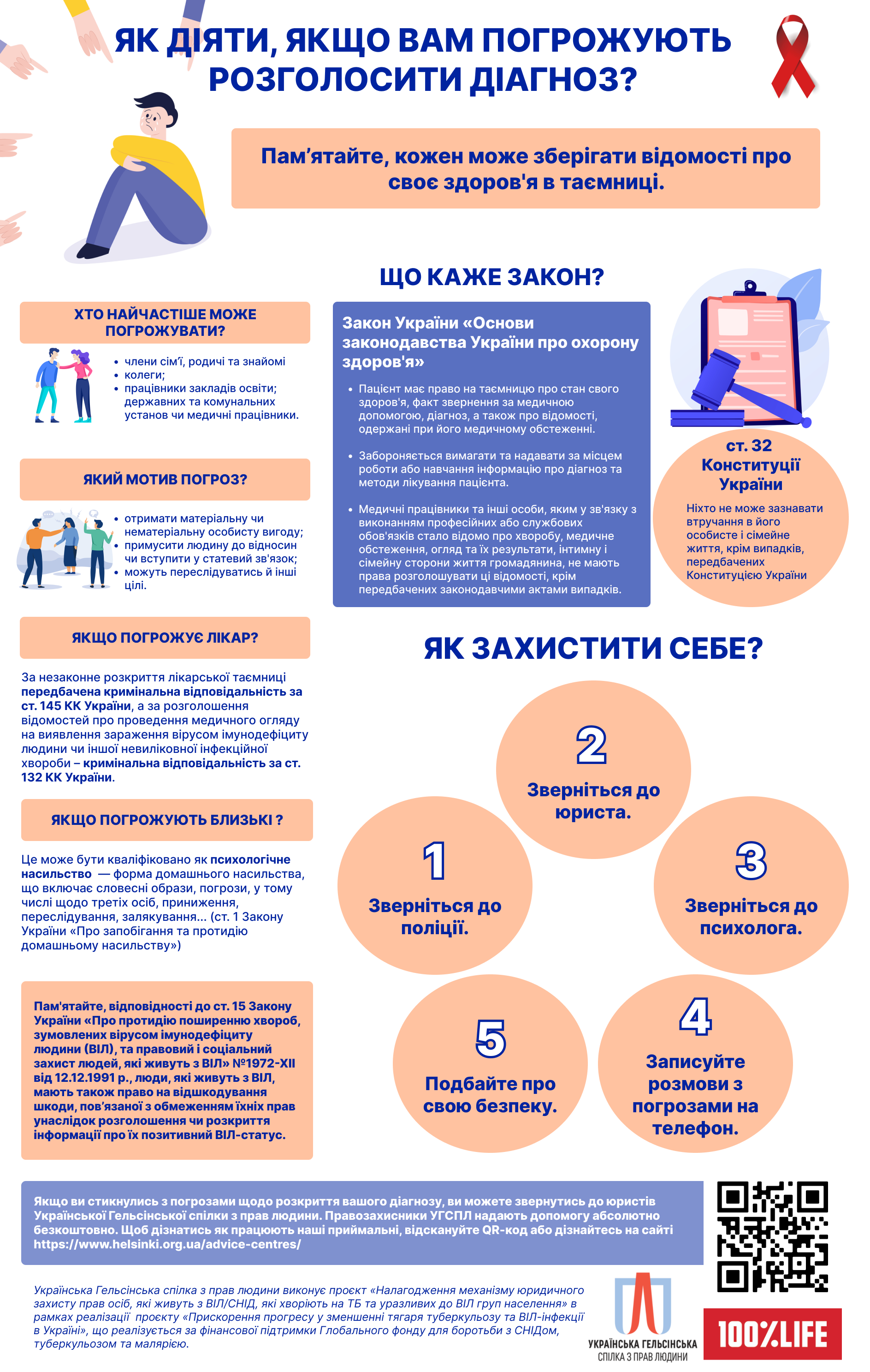 Пам’ятайте, відповідності до ст. 15 Закону України «Про протидію поширенню хвороб, зумовлених вірусом імунодефіциту людини (ВІЛ), та правовий і соціальний захист людей, які живуть з ВІЛ» №1972-XII від 12.12.1991 р., люди, які живуть з ВІЛ, мають також право на відшкодування шкоди, пов’язаної з обмеженням їхніх прав унаслідок розголошення чи розкриття інформації про їх позитивний ВІЛ-статус.