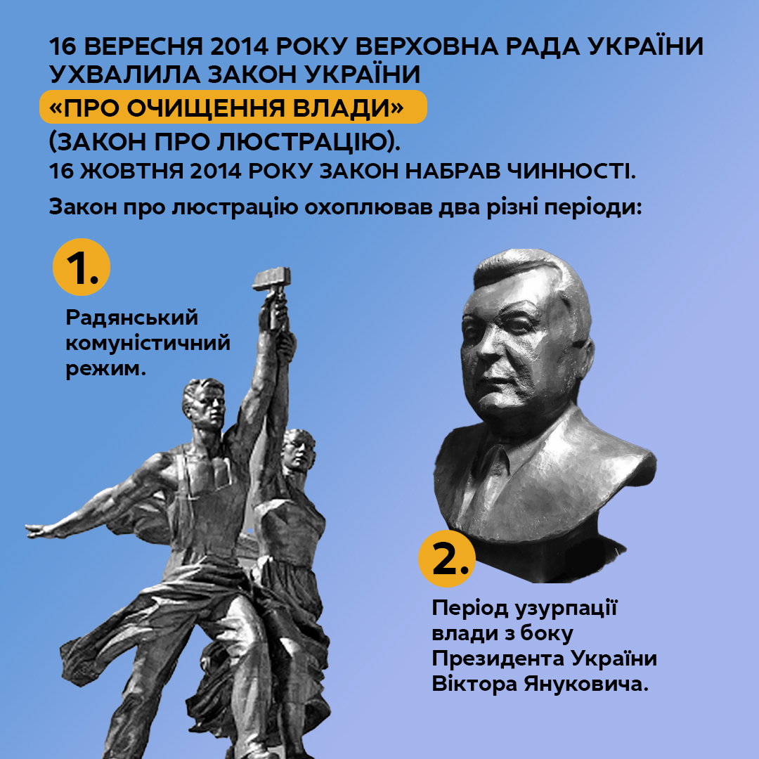 16 вересня 2014 року Верховна Рада України ухвалила Закон України «Про очищення влади» (далі – закон про люстрацію). 9 жовтня 2014 року він був підписаний Президентом України, 15 жовтня 2014 року – опублікований, 16 жовтня 2014 року – набрав чинності.