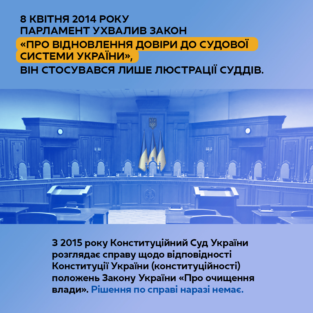 Окрім Закону України «Про очищення влади», трохи раніше, 8 квітня 2014 року, Парламент прийняв Закон України «Про відновлення довіри до судової системи України», він стосувався лише люстрації суддів.