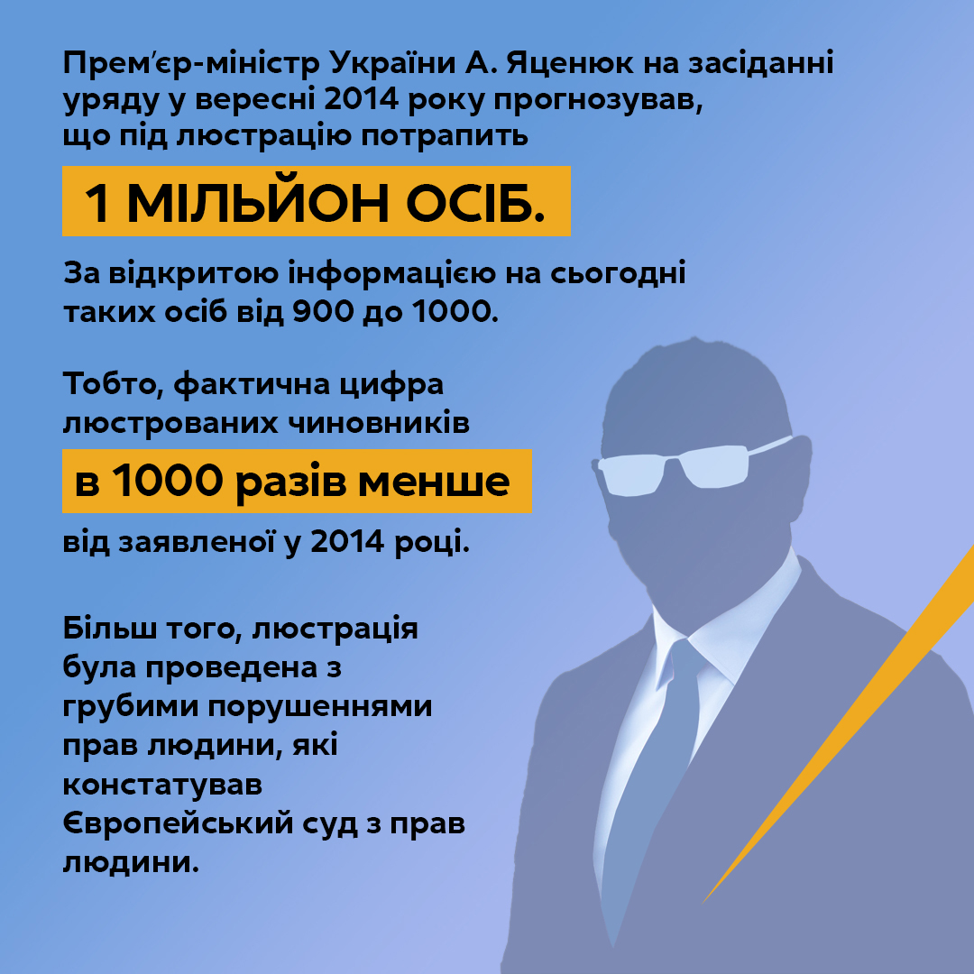 Тобто, фактична цифра люстрованих чиновників в 1000 разів менше від заявленої у 2014 році.