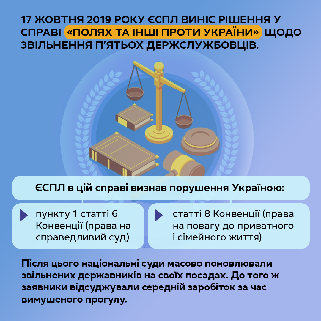 Після рішення ЄСПЛ у справі «Полях та інші проти України» національні суди масово поновлювали звільнених державників на своїх посадах та стягували середній заробіток за час вимушеного прогулу. Як результат – значні грошові суми підлягають відшкодуванню з державного бюджету на підставі судових рішень.