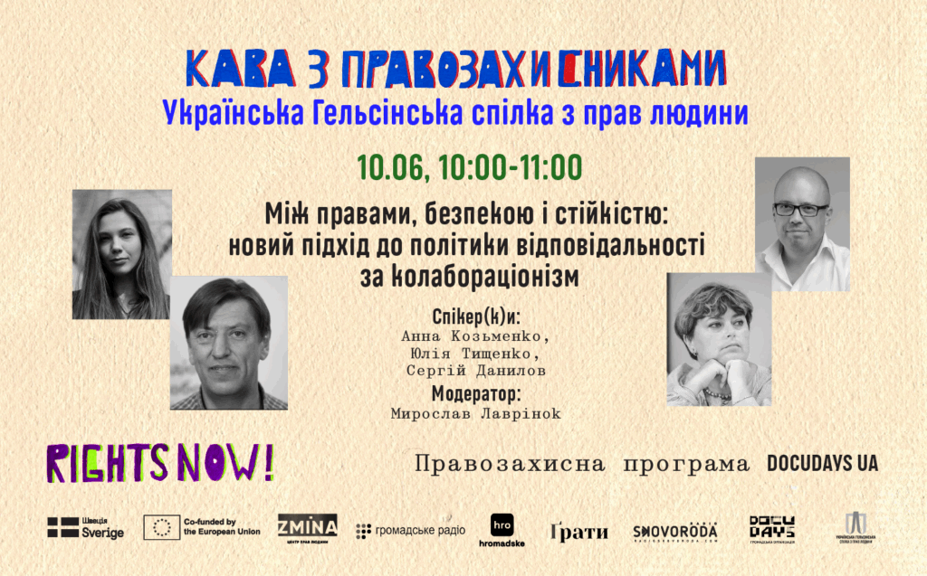 Запрошуємо на Каву з правозахисниками «Між правами, безпекою і стійкістю: новий підхід до політики відповідальності за колабораціонізм» в рамках Правозахисної програми Rights Now! 22 Міжнародного фестивалю документального кіно про права людини Docudays UA!