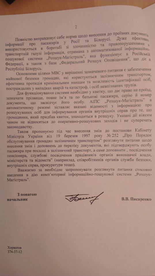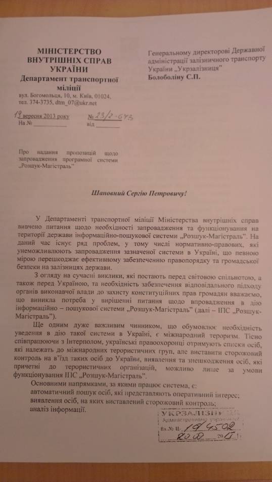 В документі йдеться про те, що вітчизняні міліціонери хочуть в своїй роботі скористатися досвідом Росії та Білорусії, та вносити дані з проїзних документів всіх пасажирів в спеціалізовану пошукову систему.