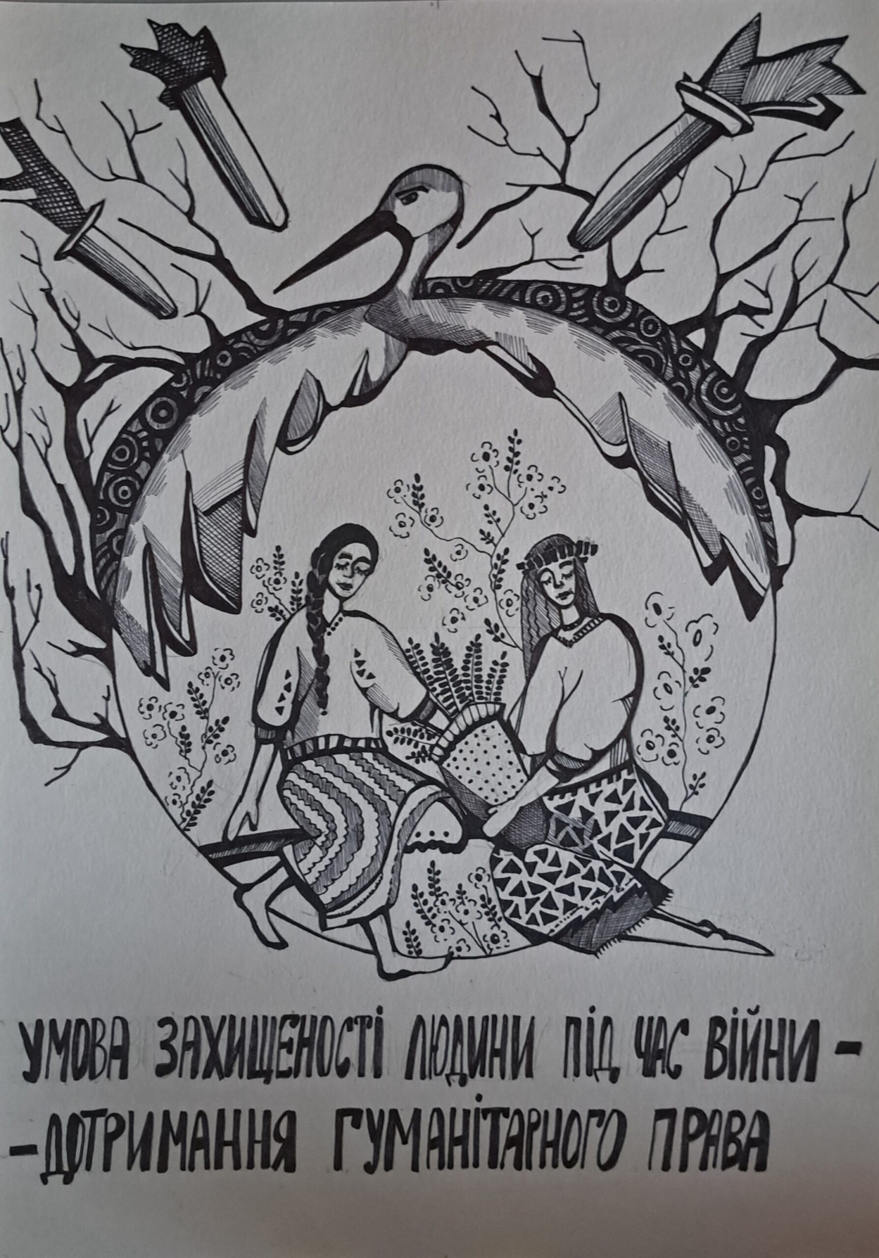 Одна з переможиць у цій номінації, Довбишева Марта, розповіла про ідею своєї роботи: «Я дуже люблю малювати, тому я обрала номінацію соціальний плакат. Я вважаю, що малюнок може розкрити якусь проблему і через нього було зручно відобразити своє ставлення до теми міжнародного гуманітарного права. Образ лелеки — це символ України, символ птаха, який захищає. Це символ міжнародного гуманітарного права, яке може захистити життя людей від російських ракет та небезпеки».