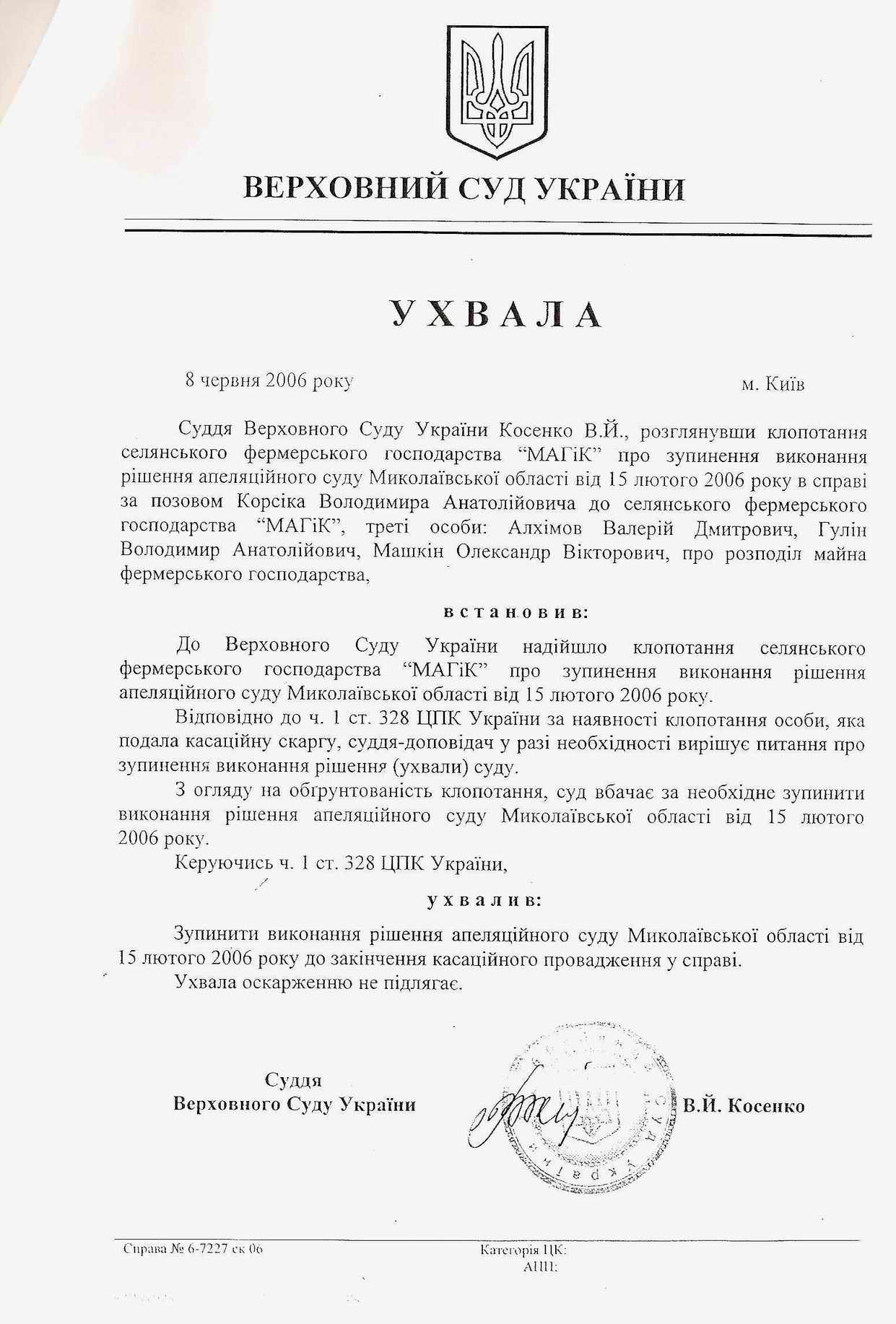 3 квітня 2006 року листом від імені Верховного суду України (№6-7227ск06) за підписом Заступника начальника управління забезпечення діяльності Судової палати в цивільних справах ВСУ Г.М. Івженко Корсіку була надіслана Ухвала ВСУ від 15 березня 2006 року (дивіться додаток), у котрій ВСУ прийняв до касаційного розгляду касаційну скаргу, постановив витребувати справу та відмовив у клопотанні господарства про призупинення виконання рішення апеляційного суду від 15 лютого2006 року, котре вступило в силу. До 21 квітня сторонам необхідно було подати заперечення до цієї касаційної скарги.