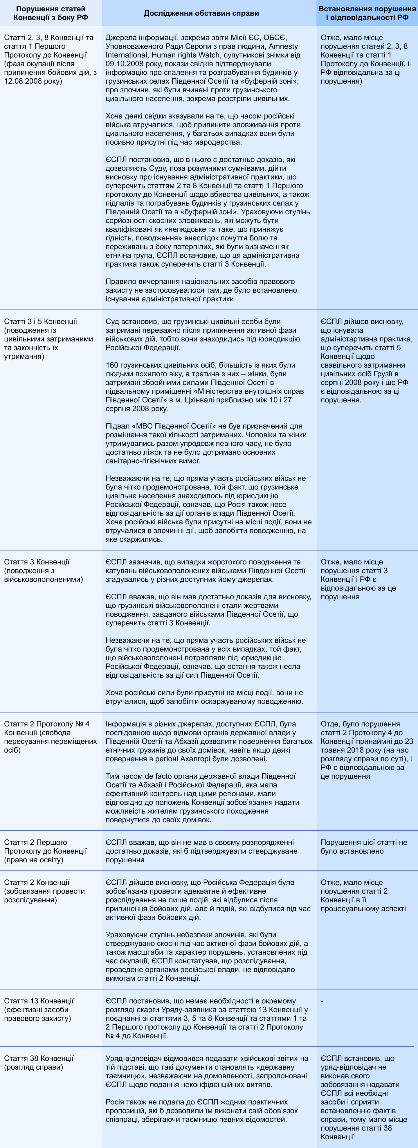 По суті Суд вказав на те, що РФ несе відповідальність не лише за дії, але і за бездіяльність, тобто пасивне спостереження за тим, як цивільне населення піддавалося жорстокому поводженню, а будинки – підпалам і грабежу. ЄСПЛ розділив позицію Грузії, визнавши відповідальність Росії за тортури і негуманне ставлення до грузинських військовослужбовців і грузинського цивільного населення. ЄСПЛ також ухвалив рішення про відповідальність Росії за нерозслідувані вбивства цивільних осіб, вчинені під час бойових дій в серпні 2008 року.