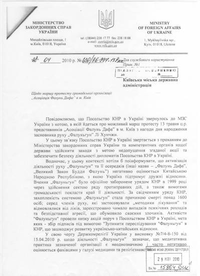 28 квітня 2010 року Міністерство закордонних справ України (МЗС) повідомило Київську міську державну адміністрацію (КМДА) (лист №630/36-994-138дск (для службового користування) за підписом заступника міністра О. О. Горіна) «що Посольство КНР в Україні звернулось до МЗС України з нотою, в якій йдеться про можливий марш протесту 13 травня ц. р. представників «Асоціації Фалунь Дафа» в м. Київ з нагоди дня народження засновника руху «Фалуньгун» Лі Хунчжи. У цьому зв’язку Посольство КНР в Україні звертається з проханням до Міністерства закордонних справ України та компетентних органів нашої держави здійснити заходи з метою недопущення згаданої акції та забезпечити безпеку діяльності дипломатів Посольства КНР в Україні».