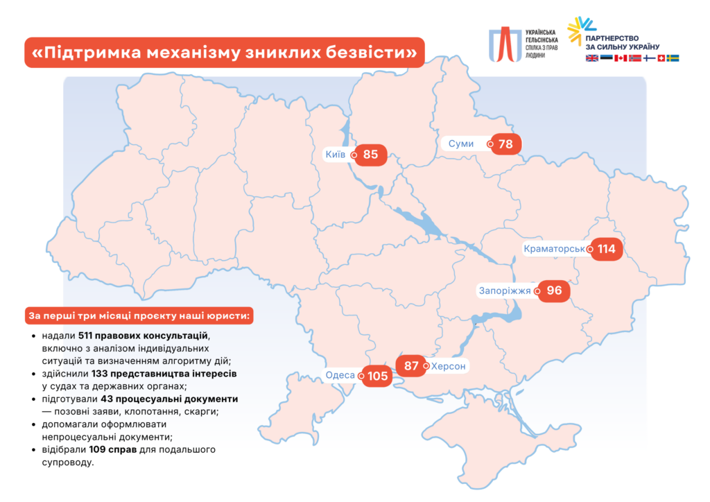 За перші три місяці реалізації проєкту «Підтримка механізму зниклих безвісти» юристи УГСПЛ провели 565 сервісних сесій у шести регіонах України та взяли до провадження три стратегічні справи. Цифри підтверджують: запит на правову допомогу серед родин військових, зниклих безвісти та полонених — величезний.