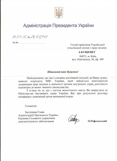 Сьогодні Українська Гельсінська спілка з прав людини отримала відповідь з адміністрації Президента України на своє звернення стосовно відсутності реакції Міністра МВС на критику Президента.