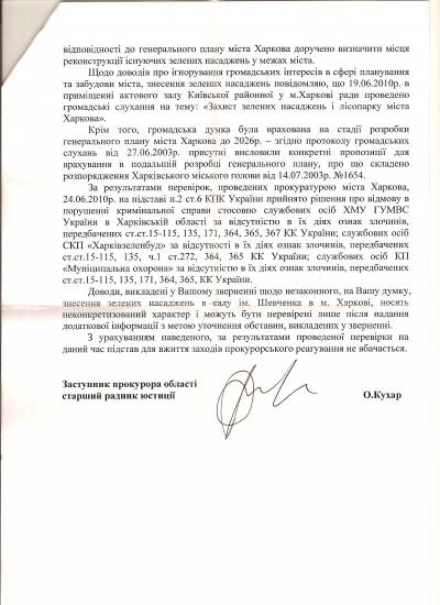 В листі за підписом заступника прокурора О. Кухара йдеться про те, що ані міліціонери, які били чи незаконно затримували захисників парку Горького, ані невідомі люди в чорному – «Муніципальна охорона», які так само вчиняли насильницькі дії у відношенні до захисників природи – не вчиняли злочину.