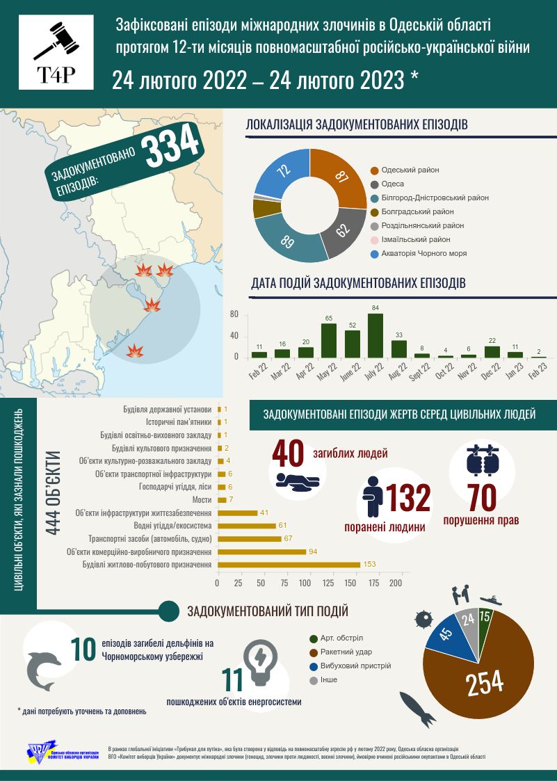 У цій публікації подається узагальнення інформації, зібраної Одеською обласною організацією ВГО «Комітет виборців України», у рамках глобальної ініціативи «Трибунал для путіна» про ймовірно скоєні міжнародні злочини за рік повномасштабної російсько-української війни.