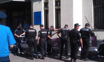 На фото: міліціонери демонтують правозахисну виставку