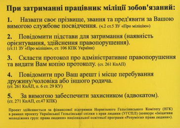 У Харкові в акції взяли участь найбільші вузи України: ХНУ Каразіна, ХНЕУ, ХПІ та інші. Коли люди бачать міліціонера, що наближається, у них виникає шок, паніка, і взагалі вони не знають, що робити. Наші брошурки і картки, випущені УГСПЛ разом з іншими організаціями, надає людям елементарну підтримку в плані інформації про те, що вони повинні робити, як записувати звання міліціонера, як з ним спілкуватися етично і правильно, розповідає про його права й обов’язки », – розповідає один з координаторів акції в Харкові Руслана Куренчук.
