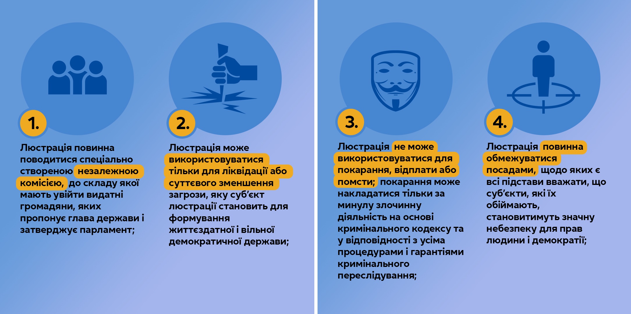 - Під час процесу люстрації повинні гарантуватися право на захист, презумпція невинуватості і право на судовий перегляд ухваленого рішення.
