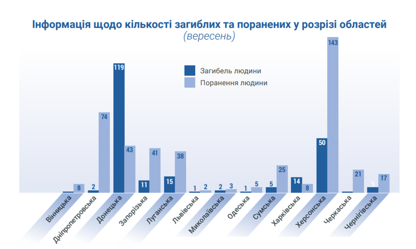 Упродовж вересня 2023 року постраждали 768 цивільних осіб. Нагадаємо, що у серпні документаторами зафіксовано 1472 постраждалих серед цивільного населення.