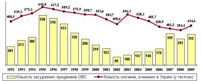 Рис 1. Порівняльний аналіз динаміки кількості злочинів, що скоєні в Україні взагалі та засуджених працівників МВС в період 1992 – 2009 рр.