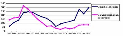 Порівняння загальної динаміки кількості службових та загально-кримінальних злочинів, вчинених працівниками ОВС, констатує збільшення питомої ваги саме злочинів у сфері службової діяльності, кількість яких у 2009 році була у 3,8 рази більшою за кількість злочинів загально-кримінального характеру (рис. 2):