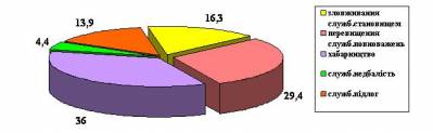 Аналіз структури злочинів, учинених персоналом ОВС у сфері службової діяльності протягом 2002−2009 рр., дозволяє констатувати переважання фактів хабарництва, перевищення службових повноважень і зловживання службовим становищем (рис.3).