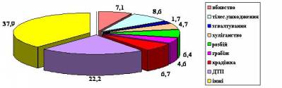 У структурі загально-кримінальних злочинів найбільш численними є ДТП (22,2%), частка яких значно перевищує показники зареєстрованих випадків спричинення тілесних ушкоджень та вчинення крадіжок – 8,6% і 6,7% відповідно (рис. 4).