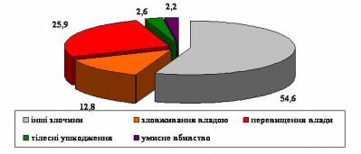 Звертає на себе увагу досить «непрозора» категорія злочинів, позначених у відомчій статистиці як «інші», питома вага яких складає більше третини (37,9%) усіх злочинів загально-кримінальної спрямованості. Зазначена категорія включає у себе кількість осіб, засуджених за фактами вчинення злочинів проти життя та здоров’я (у т.ч. за катування), проти свободи, честі та гідності особи, проти прав і свобод людини і громадянина, проти власності, проти громадської безпеки, проти безпеки руху та ін.